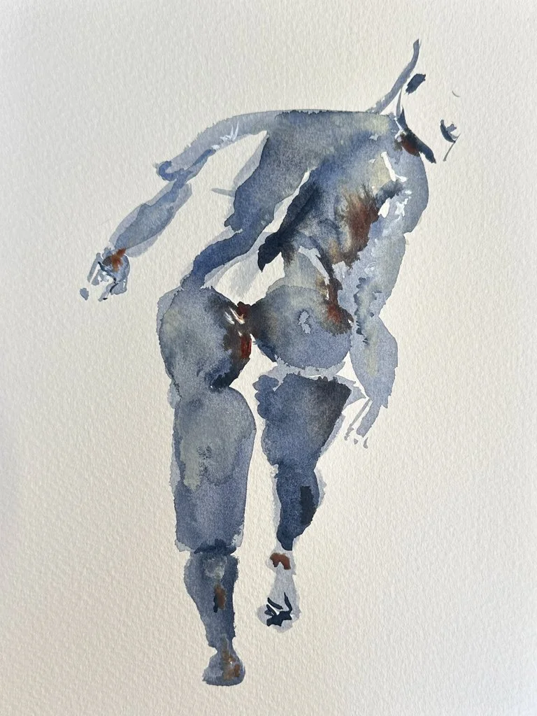 Abstract watercolor painting of a humanoid figure with dynamic pose and brown tones.
