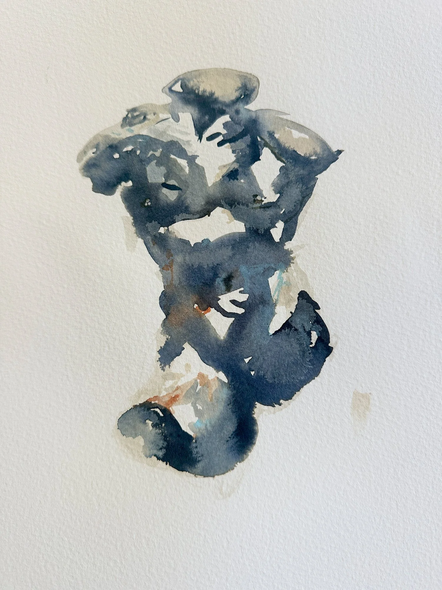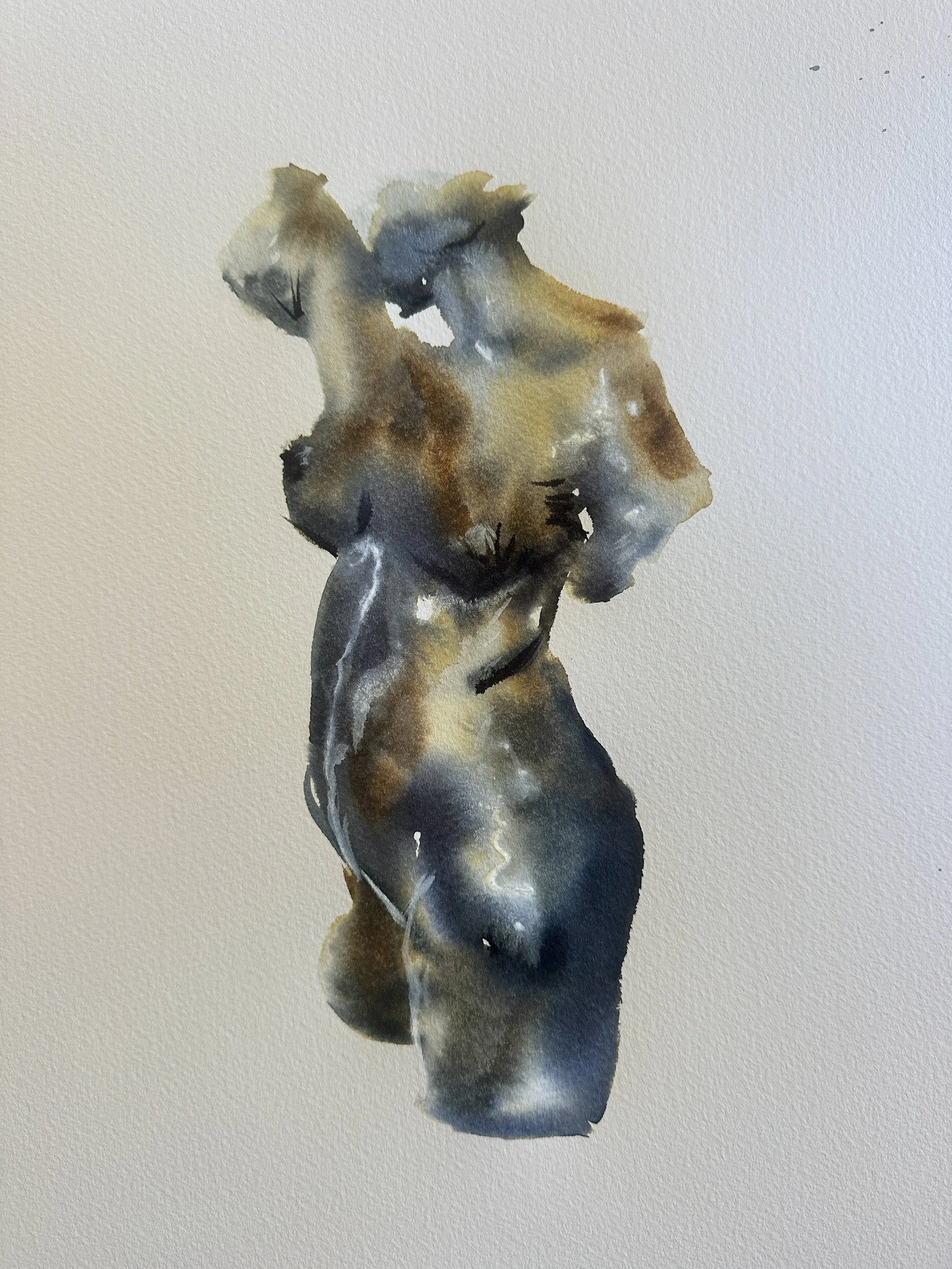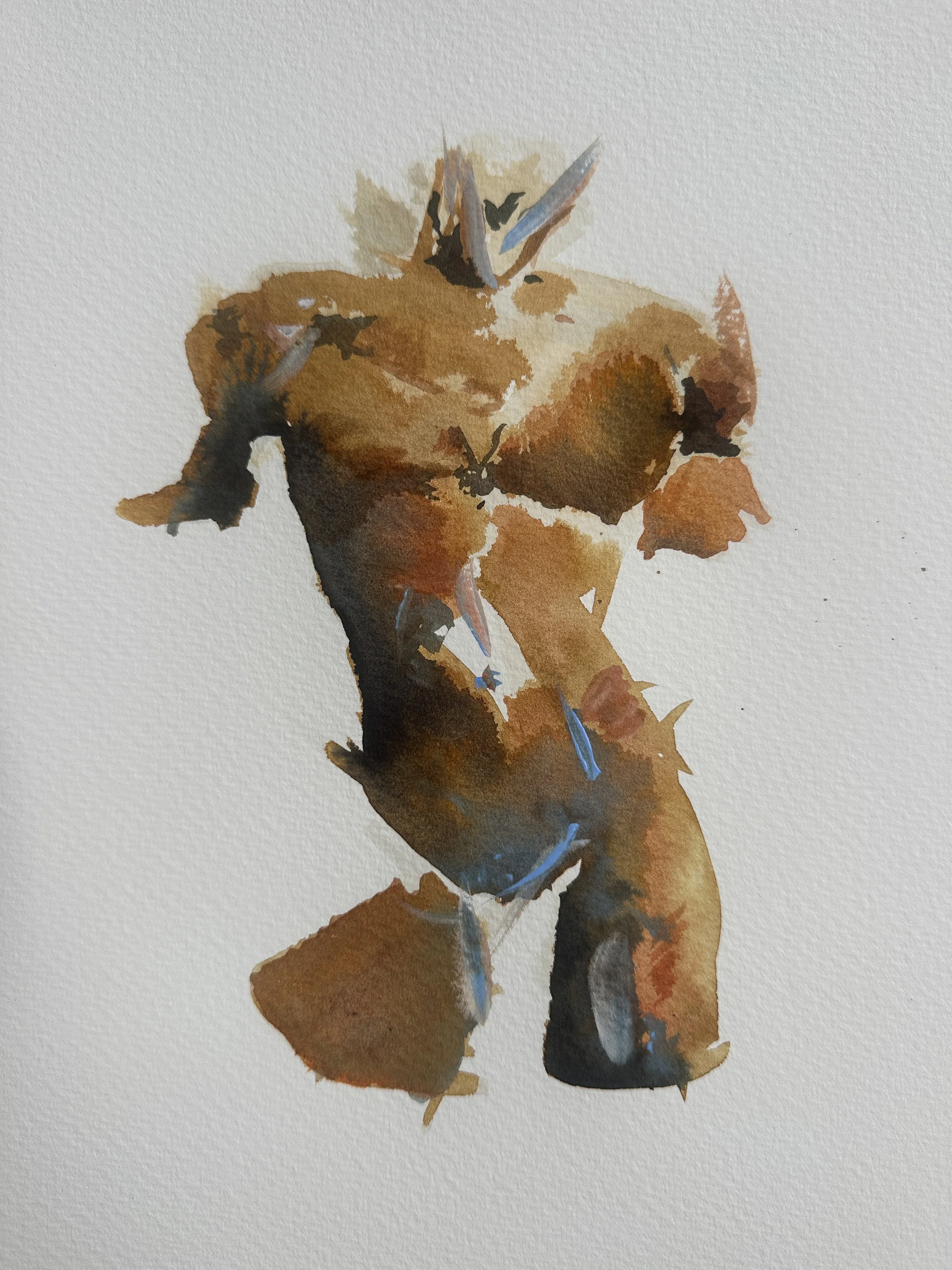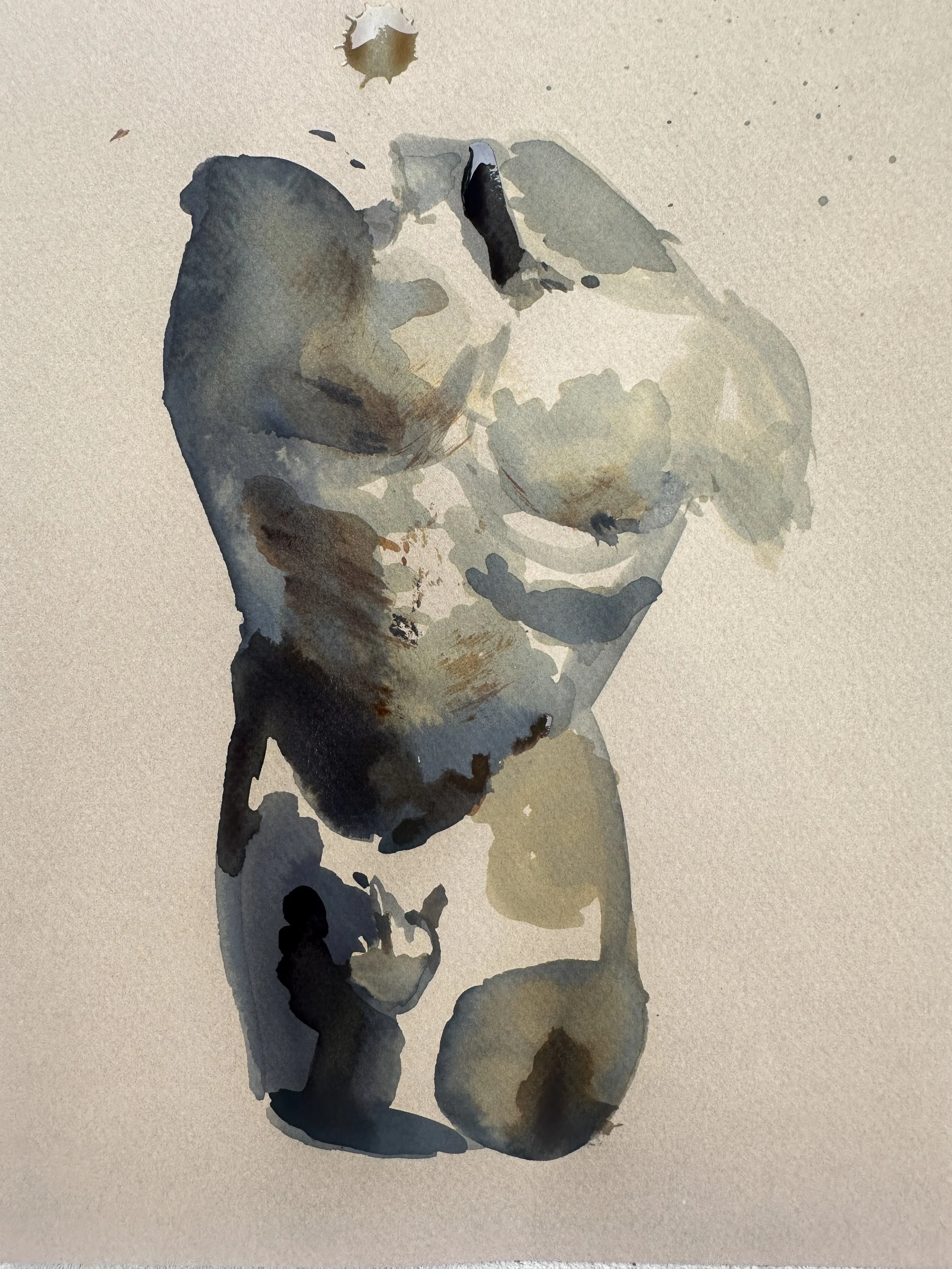 Abstract watercolor painting of a torso with earthy tones on beige background.